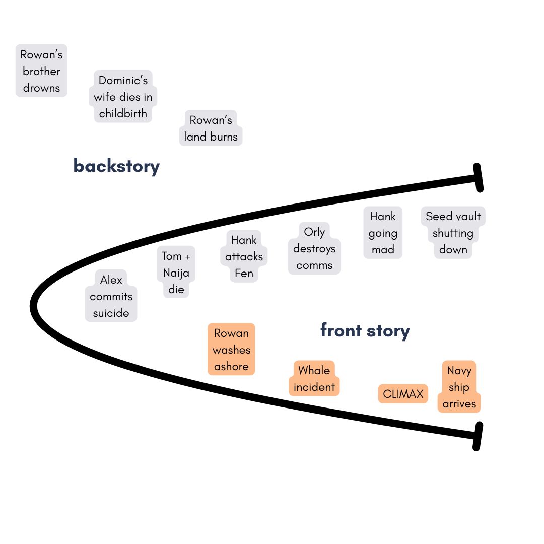 This array of plot components and backstory ghosts would likely already be enough to fuel a successful novel, but if we pull the timeline of the novel back by just a few weeks, we uncover a sequence of high-tension events that occurred just before Rowan washes ashore. Another version of this novel might have started with the news that the seed vault and research station are shutting down, meaning that the Salt family has to leave the island that has been their refuge for the past eight years.