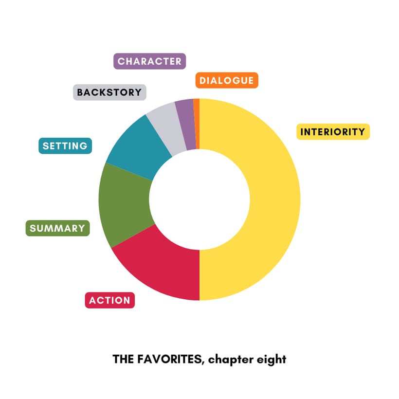 Let’s walk through chapter 8 of the novel, the first competition scene, and see how Fargo is using her palette of scene components. To start, here is the percentage breakdown: