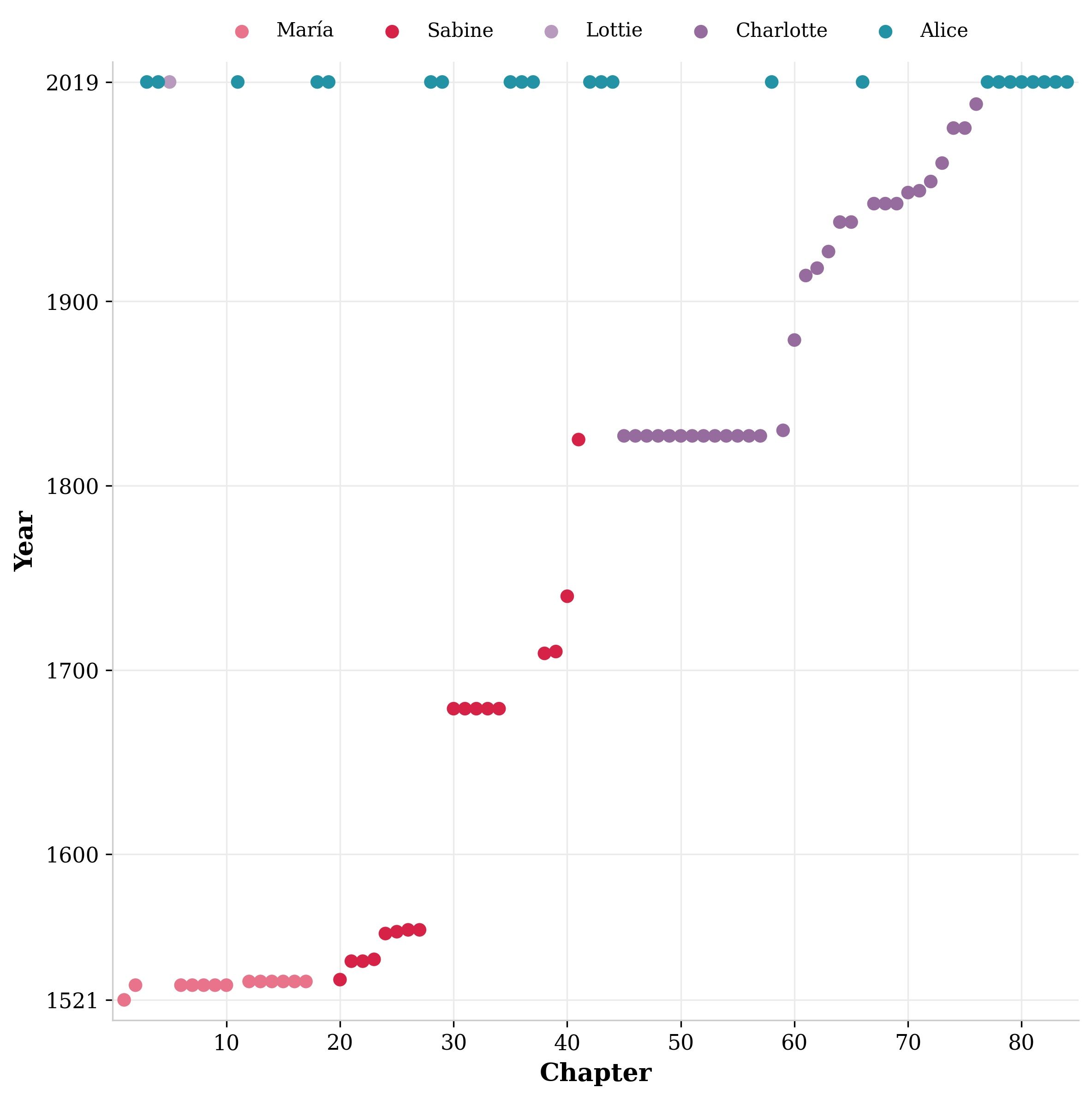 If you look again at the figure above representing the chronology of the novel, you can see how that wide angle of the opening, the gap of half a millennia, gradually sharpens to a point at the end as all of the stories we’ve seen—Sabine’s, Charlotte’s, and Catty’s—are absorbed in Alice’s story.