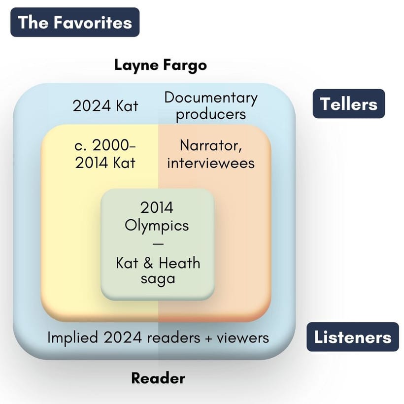That “worst day,” we soon learn, is the 2014 Olympic ice dancing performance of Kat and her boyfriend and partner Heath. Fargo is creating an implied 2024 reader/viewer here—the “you” Kat addresses already knows the basics of what happened that day. And the relationship between our narrator Kat and that 2024 implied reader is antagonistic. The 2025 reader is drawn in by the secret: What do those fictional 2024 readers know that we don’t? What did go down at that Olympics? And we are also a tiny bit suspicious of our narrator: How truthfully will she tell her own story?